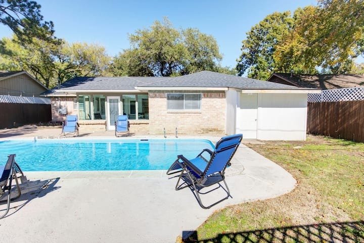 Unwind at this 4-bedroom haven featuring a sparkling pool, sunroom, and charming gazebo. Centrally located near I-10, Memorial City Mall & Memorial Hermann.